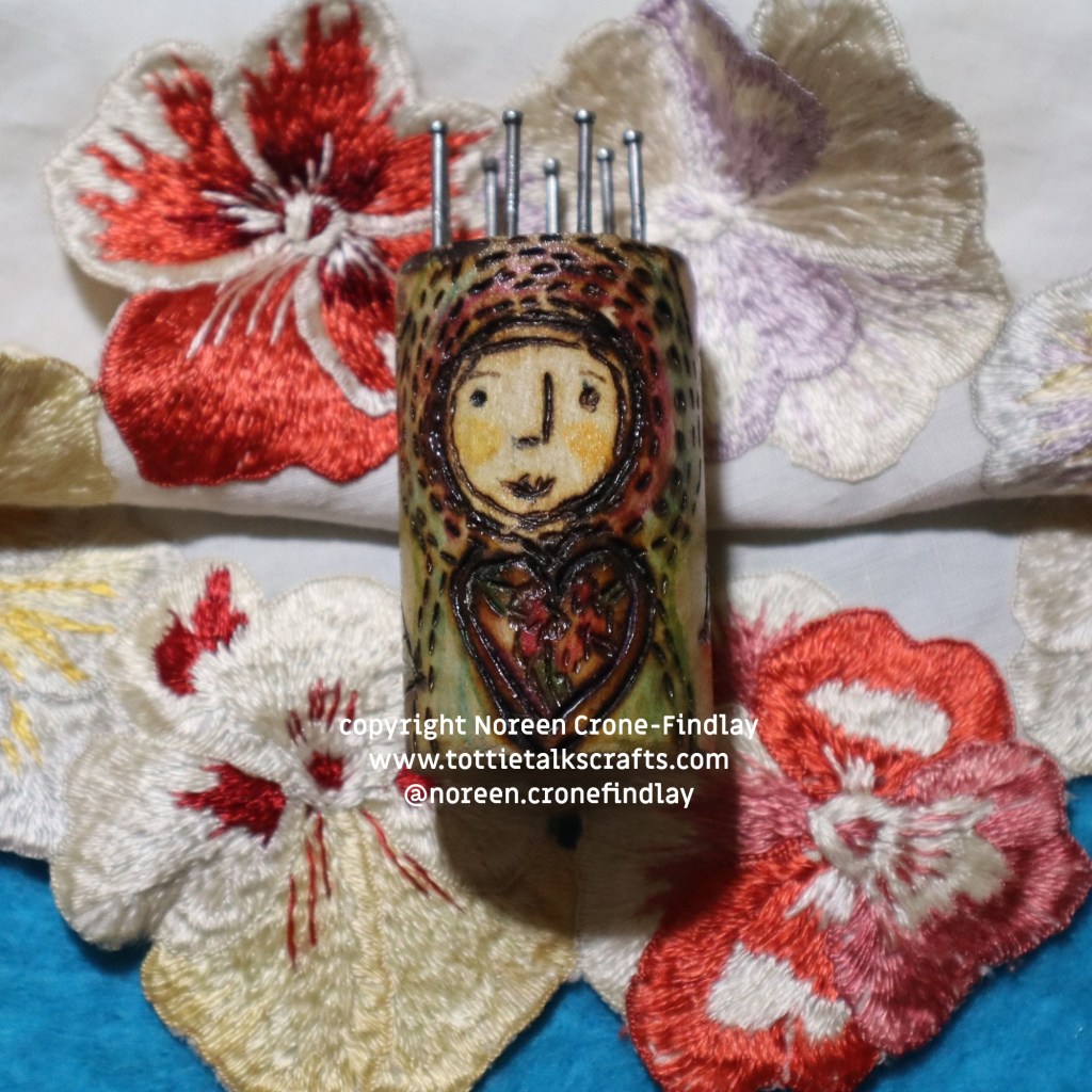 This little video by Noreen Crone-Findlay is a glimpse of her solo show of mixed media weaving: The Oracle of Stillness: Weaving Coherence in the Chaos. This series of Woven Women tapestries were created by Noreen Crone-Findlay over many years and include many mediums: fused glass, steel rod, steel and copper wire, beading, Teneriffe lace making, Tatted lace, lace and tapestry and narrow band weaving on looms specially constructed for the show by Crone-Findlay, thread, yarn, painting on wood, painting on watercolor paper, found objects, leather work, crochet, wire work, carved Tagua nut, and carved wood. The Oracle of Stillness speaks to the heart about navigating grief, sorrow around personal loss and chronic illness, as well as the shock of living in social and cultural upheaval. Noreen Crone-Findlay works with her dreams, meditations, prayers, poetry, and deep conversation to create Woven Women who embody presence, mystery, magic, The Great Beauty and the Feminine Divine. The Oracle of Stillness Woven Women are immersive, textural, layered and complex. Each one has taken hundreds of hours to complete and invite the gaze of the viewer to listen with their hearts to find the ‘ring of truth’ and point of Stillness int the quiet of the journey ‘Home’. Noreen hopes that you will find a moment of wonder or Beauty in the Oracle of Stillness Woven Women and to follow the complex threads that lead to the very center of our Being-ness. There is love in every stitch, every molecule of each of these mixed media weavings. May they bring healing…. with love. Please go to http://www.tottietalkscrafts.com for more information