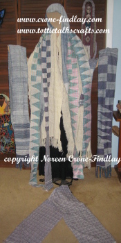 There are several yards of the jacket fabric on ‘Patient Zillah’, my ‘paper doll’ manequin- the jacket fabric is the widest, plain cream, highly textured layer under amost a hundred yards of narrow strips of fabric. I wove the jacket fabric on a rigid heddle loom.