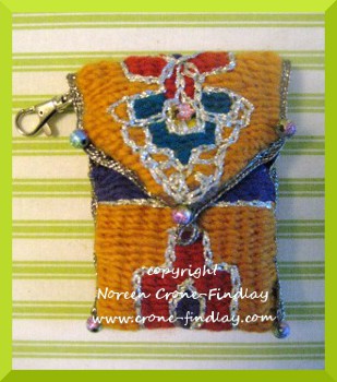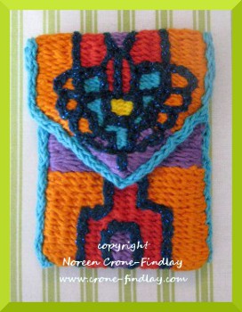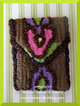 The project is a Business Card Pouch, which also works well as a cellphone pouch, woven in Soumak, embellished with corded edges and chain stitch embroidery.
