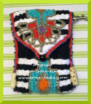 I wove it with Lion Brand Bonbon yarn- cotton for the body of the pouch and metallic for the embellishment.