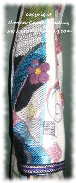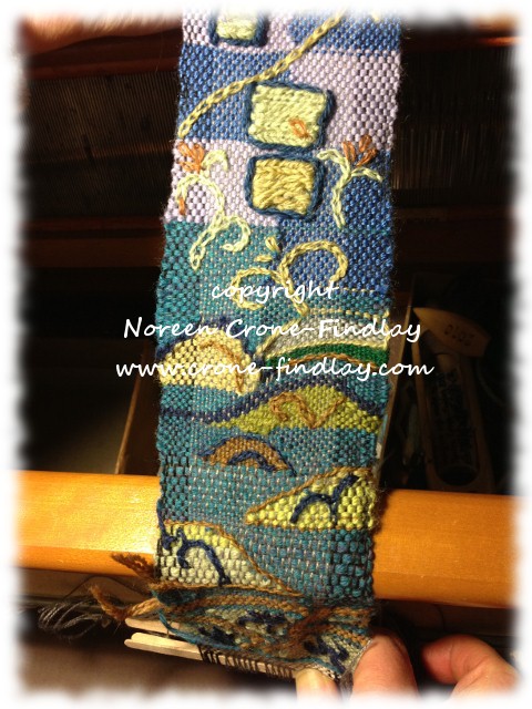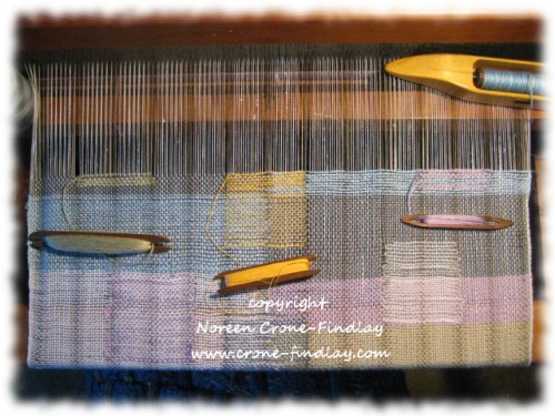 At times, when I was weaving the little squares, I had up to 8 extra shuttles in the row.