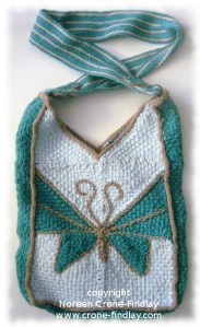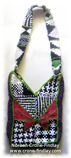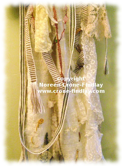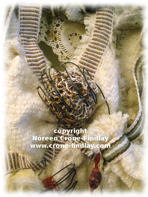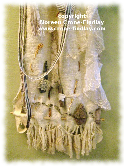 As well as my woven fabrics and inkle bands, I have also stitched and woven in antique and vintage lace fragments, tatting (tatting goes with me everywhere, and keeps me sane when I am having to wait or watch or…), smaller fragments of driftwood and seaweed, and spool knitted wire cords that I filled with sea glass.