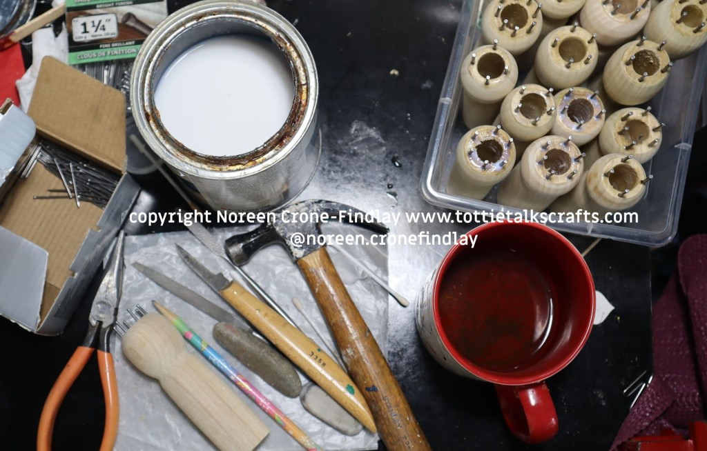 I spent Day 2 of the project working on getting a LOT of holes drilled and then fine tuning the insides of 17 small spool knitters in preparation for tapping in and gluing the nails into the holes.