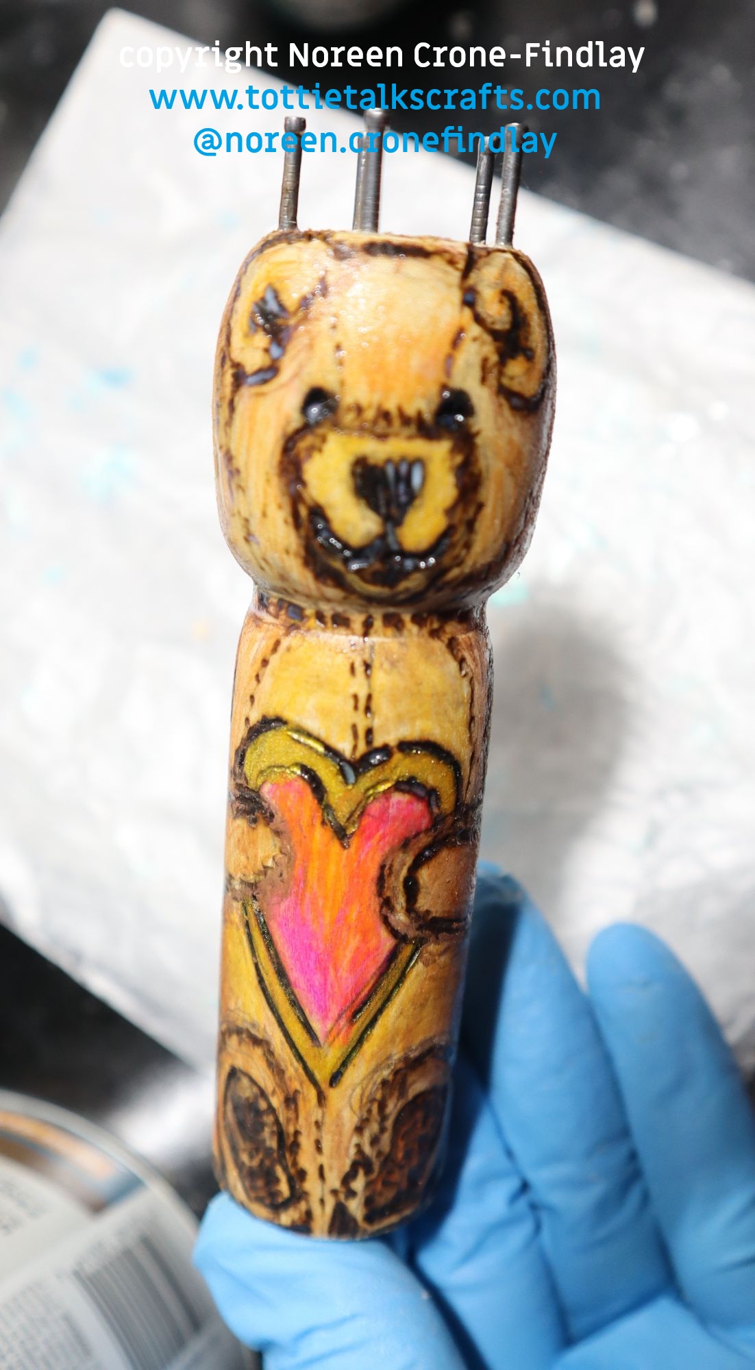 I immediately drew, then burned and painted this ‘BooBoo Bear’ and took this pic and sent it to him.
