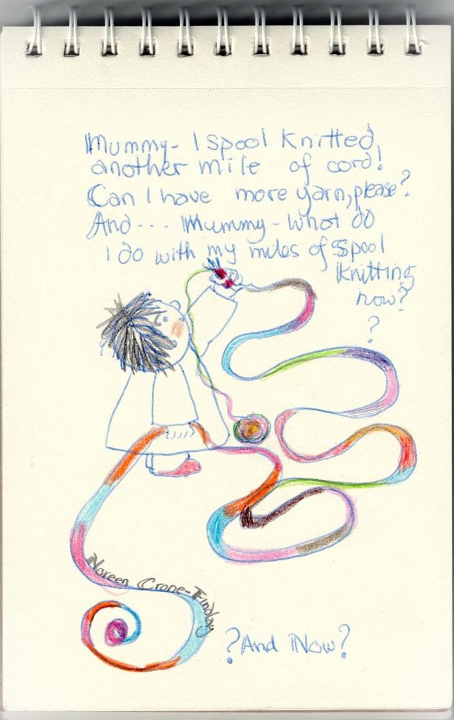 AND most important! I have been working on fun designs for things for people to MAKE with the spool knitted cords, because after all, you can infuriate your sibs by having a bigger, better, longer spool knitted cord than they do, but really- there’s a lot more fun to be had than just one upmanship in the realm of sibling rivalry. 🙂